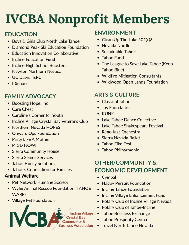 Giving Tuesday is a powerful reminder of the generosity that defines Incline Village and Crystal Bay. Nearly all of our local nonprofits are proud members of IVCBA, working every day to strengthen our community. As you consider where to give this season, remember that the Tahoe Community Foundation serves as a central hub for nonprofit resources and philanthropy across Incline Village and the greater Tahoe Basin, making it easy to support the causes you care about most.