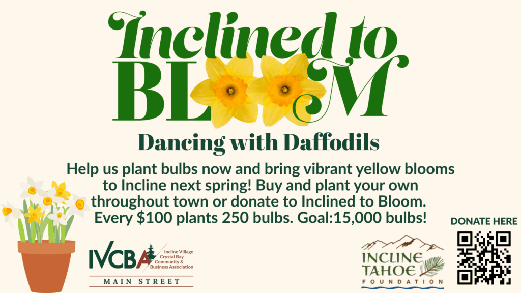 Inclined to Bloom and Dancing with Daffodils are part of the Incline Village Main Street Beautification campaign. Beautification supports IVCBA’s mission of “building cohesiveness for the sustainability of Incline Village and Crystal Bay. Its vision is a “thriving community that supports and is supported by its agencies, businesses, nonprofits, and residents.”