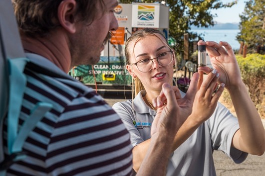“It wasn’t until I worked at the watercraft inspection station that I saw how vulnerable the lake is to invasive species,” said Leland Li, a watercraft inspector turned roving inspector. “The folks I talk to are the same—people care and want to protect the lake but may not be aware of all the threats. When beachgoers are educated, they spread the word to others and amplify the effect of our work.”