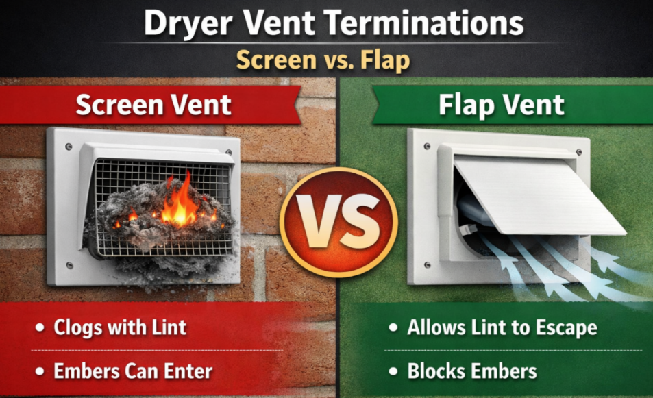 - Ensure the exterior vent flap opens freely and is not blocked (including snow or debris). Flap-style termination instead of a screen—screens trap lint and can accumulate ember-ignitable fuel while also restricting airflow