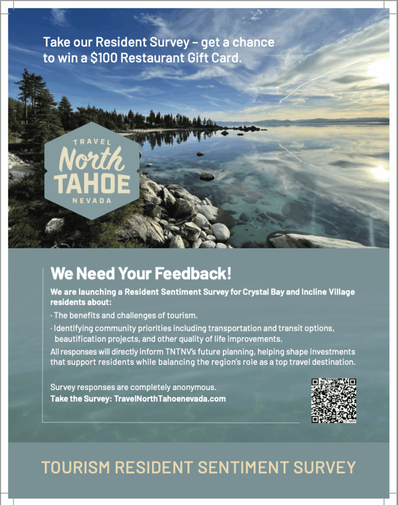 To better understand how tourism and community needs intersect, Travel North Tahoe Nevada (TNTNV) (TNTNV) is launching a resident sentiment survey in partnership with Longwoods International as part of their national survey initiative. The goal is to gather feedback from residents about the benefits and challenges of tourism while also identifying community priorities such as expanded transportation and transit options, downtown beautification projects, and other initiatives that improve quality of life for residents. Residents who complete the survey will be entered to win a $100 gift card to a local restaurant.