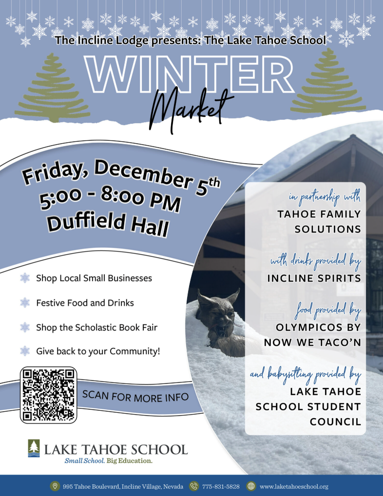 Welcome to the Lake Tahoe School Winter Market, a festive and vibrant event designed to delight every member of the family! While parents explore the local small business booths and festive raffle, our older students take center stage by hosting their own small shops within the market, gaining real-world experience in entrepreneurship. Younger children are also cared for and entertained: our dedicated Student Council will be offering a supervised babysitting service for children in Kindergarten through 4th grade, and the evening will be filled with beautiful music, including a special performance by our talented LTS student choir.
